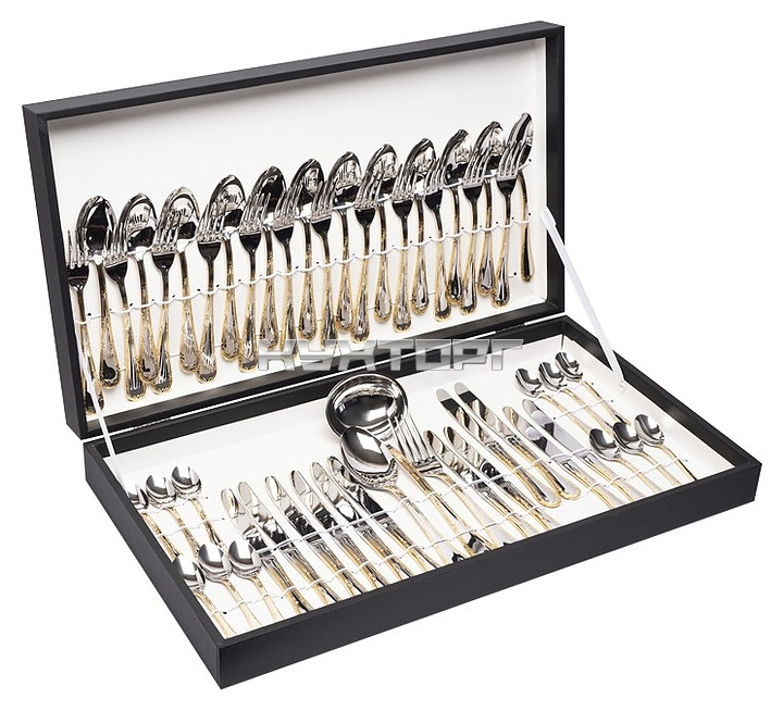 В комплект поставки входят 12 столовых ложек, 12 вилок, 12 столовых ножей, 12 ложек для кофе, 1 половник, 1 сервировочная вилка с 4 зубцами и сервировочная ложка.