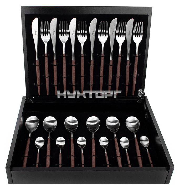 В комплект поставки входят 6 столовых ножей, 6 столовых вилок, 6 столовых ложек и 6 чайных ложек.