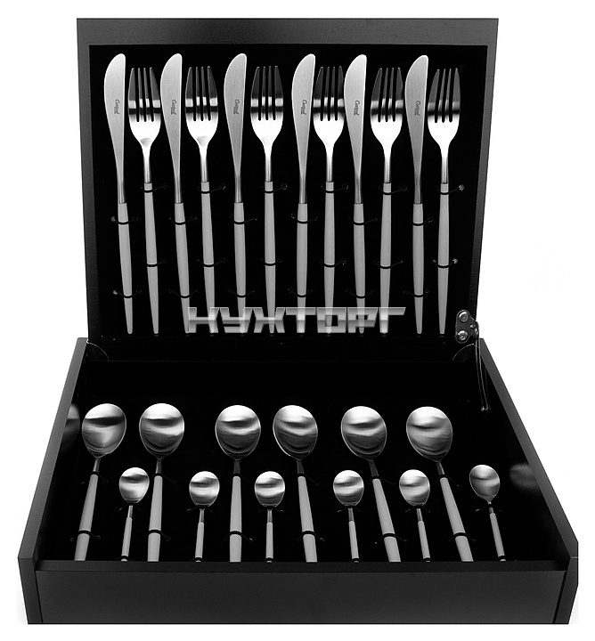 В комплект поставки входят 6 столовых ножей, 6 столовых вилок, 6 столовых ложек и 6 чайных ложек.