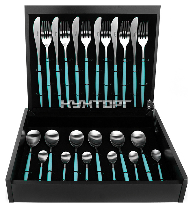 В комплект поставки входят 6 столовых ножей, 6 столовых вилок, 6 столовых ложек и 6 чайных ложек.