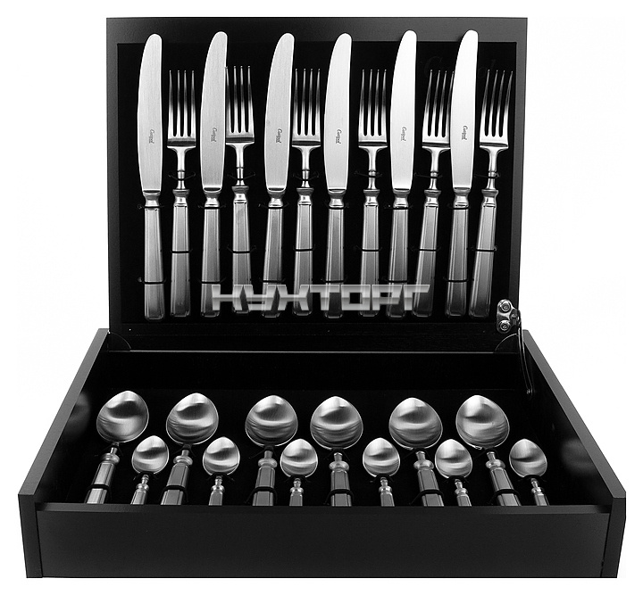 В комплект поставки входят 6 столовых ножей, 6 столовых вилок, 6 столовых и 6 чайных ложек.