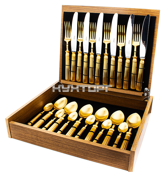 Набор столовых приборов Cutipol Line L.006 GB используется на предприятиях общественного питания и торговли, а также в частных домах и квартирах. Приборы изготовлены из специально закаленной нержавеющей стали 18/10 с матовой полировкой c позолотой 5 мкр.