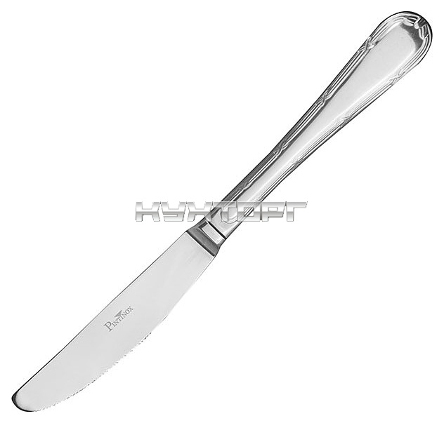 Нож Pintinox Stuttgart 13000003 используется в качестве столового прибора на предприятиях общественного питания и в домашних условиях. Модель оснащена головкой с зазубренным лезвием, расширенной кверху рукояткой с декоративной рельефной кромкой и округлым наконечником. Изделие выполнено из высококачественной пищевой нержавеющей углеродистой стали 18/0 с глянцевой серебристой поверхностью.