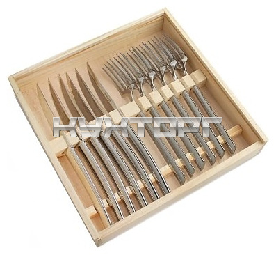 В комплект поставки входят 6 ножей и 6 вилок для стейка в деревянной коробке.