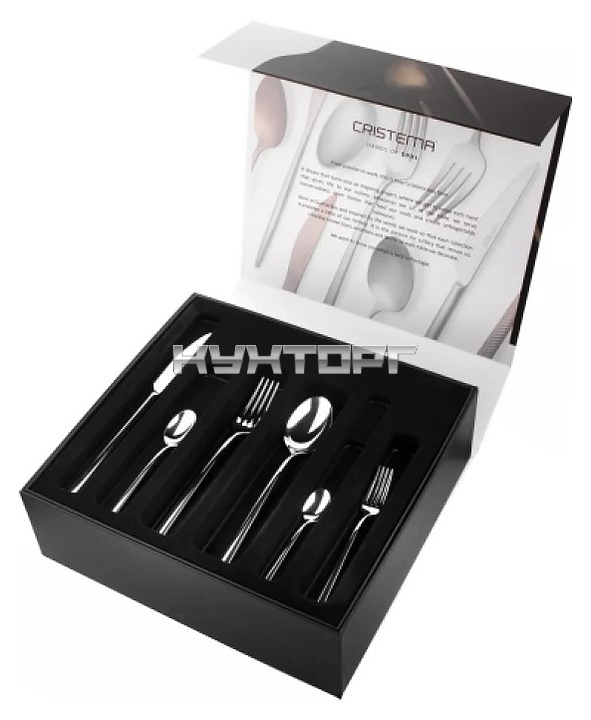 В комплект поставки входят 12 столовых ножей, 12 столовых вилок, 12 столовых и 12 чайных ложек, 12 десертных вилок, 12 кофейных ложек, половник, сервировочная ложка и лопатка.
