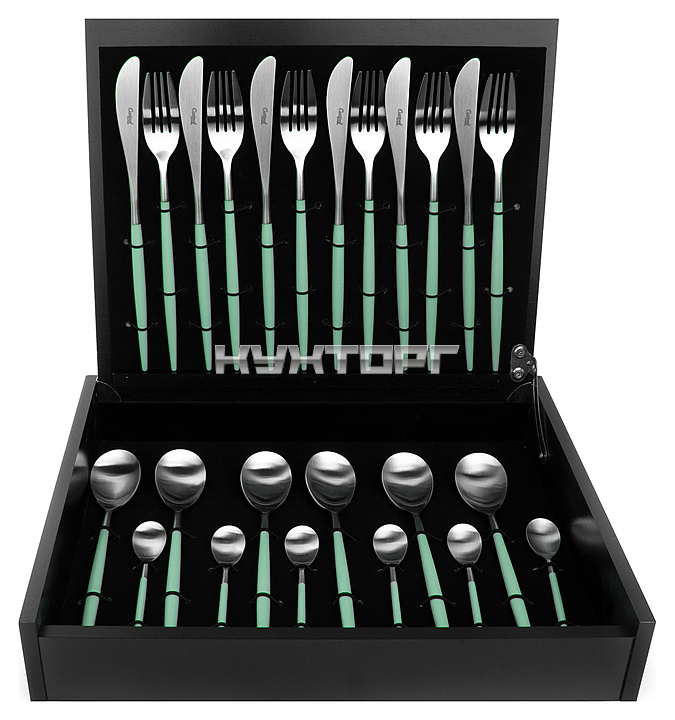 В комплект поставки входят 6 столовых ножей, 6 столовых вилок, 6 столовых ложек и 6 чайных ложек.
