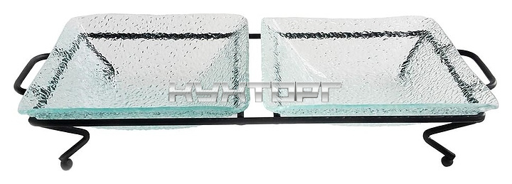Фуршетная подставка P.L. Proff Cuisine P22069 предназначена для выкладки хлебобулочных изделий, колбас, сыров, различных закусок и блюд при организации шведского стола на предприятиях общественного питания и в домашних условиях. Модель состоит из опорной стойки и 2 прямоугольных блюд с бортами. Стойка оснащена 4 изогнутыми ножками и 2 рукоятками для удобства транспортировки. Блюда выполнены из структурированного полупрозрачного стекла голубого оттенка с гладкой верхней стороной, стойка – из металла.