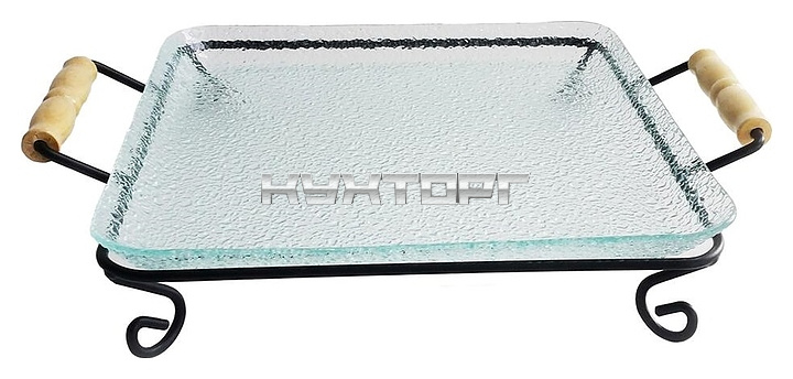 Фуршетная подставка P.L. Proff Cuisine P2323 предназначена для выкладки хлебобулочных изделий, колбас, сыров, различных закусок и блюд при организации шведского стола на предприятиях общественного питания и в домашних условиях. Модель состоит из опорной стойки и прямоугольного блюда с бортами. Стойка оснащена 4 изогнутыми ножками и 2 рукоятками с вращающимися рельефными накладками для удобства транспортировки. Блюдо выполнено из структурированного полупрозрачного стекла голубого оттенка с гладкой верхней стороной, стойка – из металла, накладки – из дерева.
