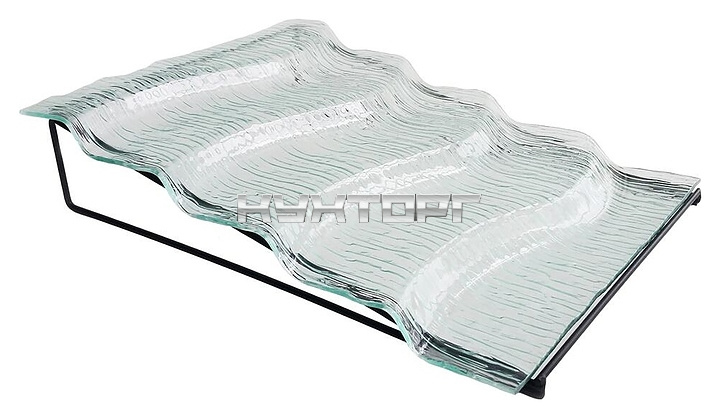 Фуршетная подставка P.L. Proff Cuisine P2083 предназначена для выкладки хлебобулочных изделий, колбас, сыров, различных закусок и блюд при организации шведского стола на предприятиях общественного питания и в домашних условиях. Модель состоит из наклонной опорной стойки и фигурного блюда в виде волнообразной лесенки. Блюдо выполнено из структурированного полупрозрачного стекла голубого оттенка с гладкой верхней стороной, стойка – из металла.