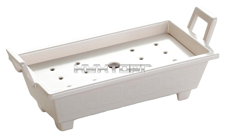 Блюдо P.L. Proff Cuisine J449994TZ-GC White предназначено для выкладки различных закусок в процессе сервировки стола на предприятиях общественного питания и в домашних условиях. Модель прямоугольной формы оснащена высокими наклонными бортами, 4 опорами, 2 рукоятками и перфорированным поддоном. Изделие выполнено из меламиновой смолы белого цвета.