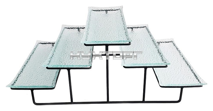 Фуршетная подставка P.L. Proff Cuisine P2131 предназначена для выкладки хлебобулочных изделий, колбас, сыров, различных закусок и блюд при организации шведского стола на предприятиях общественного питания и в домашних условиях. Модель состоит из опорной стойки и 5 прямоугольных блюд с бортами. Стойка в виде 2-сторонней лесенки оснащена 3 ступенчатыми ярусами и 2 ножками. Блюда выполнены из структурированного полупрозрачного стекла голубого оттенка с гладкой верхней стороной, стойка – из металла.