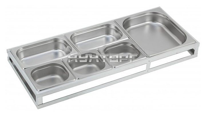 Подставка для гастроемкостей Osba 5+1 предназначена для размещения гастроемкостей на предприятиях общественного питания и торговли. Каркас выполнен из алюминиевого уголка.