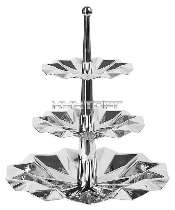 Этажерка Luxstahl Оригами 165/210/300 мм предназначена для выкладки в процессе сервировки стола хлебобулочных изделий, колбас, сыров, различных закусок и блюд на предприятиях общественного питания и торговли, а также в домашних условиях. Модель оснащена конической стойкой с шарообразным наконечником-рукояткой и 3 платформами с декоративной рельефной имитацией складок фигурок оригами. Изделие выполнено из высококачественной нержавеющей стали с серебристой поверхностью.