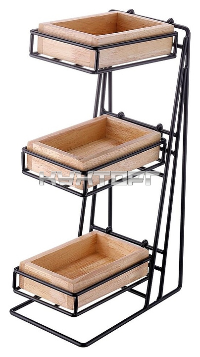 Фуршетная подставка Sunnex M029-5-UK используется для размещения хлебобулочных изделий или фруктов в процессе сервировки шведских столов на предприятиях общественного питания. Модель имеет 3 яруса. Каркас выполнен из нержавеющей стали, блюда прямоугольной формы – из дерева.