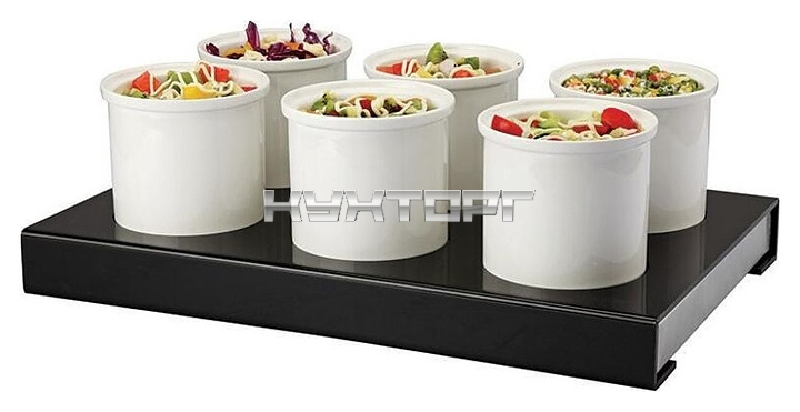 Поднос Sunnex M1269-1/1 используется на предприятиях общественного питания а также в домашних условиях в процессе сервировки шведского стола для выкладки предварительно охлажденных салатов. Модель оснащена рамой с отверстиями для салатников и боксом со съемным охлаждающим элементом. Рама выполнена из черного акрила, салатники – из белого фарфора, бокс – из нержавеющей стали.