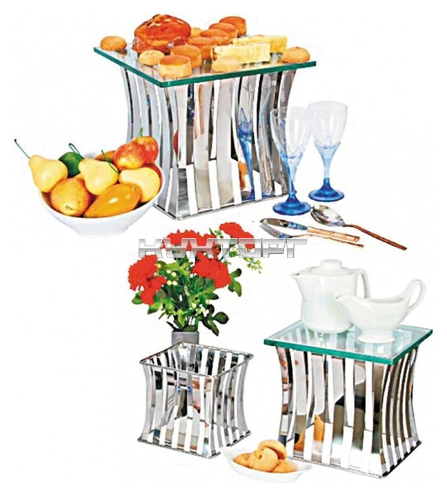 Набор подставок P.L. Proff Cuisine 73024073 используется в процессе сервировки шведских столов, на банкетах и фуршетах для размещения и демонстрации широкого спектра блюд и напитков. Основания выполнены из металла, рабочая поверхность - из стекла.