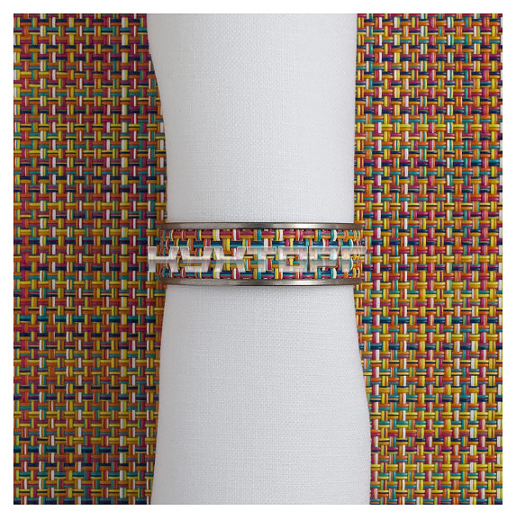 Кольцо CHILEWICH 0802-MNBK-CONF серии Stainless steel используется совместно с плейсматами Confetti (100324-005) и аналогичными моделями на предприятиях общественного питания и в домашних условиях для размещения в свернутом виде салфеток или полотенец в процессе сервировки стола. Корпус выполнен из нержавеющей стали с накладкой из разноцветных переплетенных виниловых волокон.