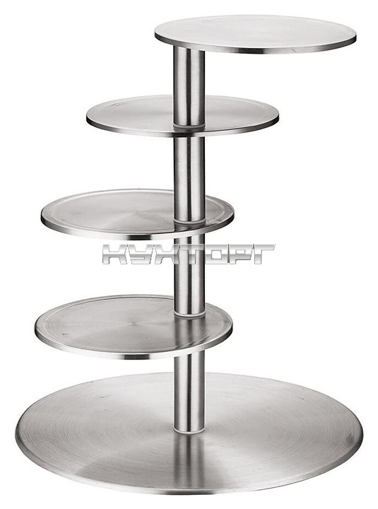 Этажерка P.L. Proff Cuisine 99002216 используется на предприятиях общественного питания и торговли, в барах, ресторанах и кафе для сервировки и выкладки различных десертов, пирожных и тортов. Модель имеет 5 ярусов. Изделие выполнено из нержавеющей стали.