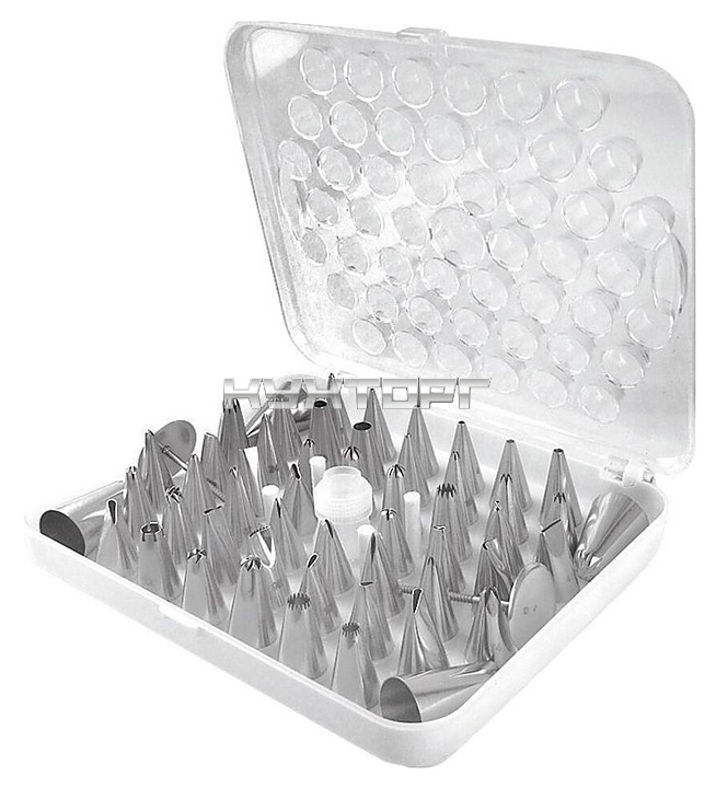 Набор кондитерских насадок P.L. Proff Cuisine TIPS-B-55PC/TIP-AT-56/001 используется совместно с заправленным кремом мешком для декорирования кондитерских изделий на предприятиях общественного питания и в домашних условиях. Набор состоит из 55 конических насадок с выпускными отверстиями различных формы и диметра, компактно упакованных в контейнер с крышкой и индивидуальными ячейками. Изделия выполнены из нержавеющей стали.