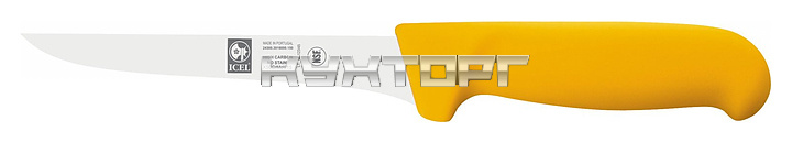Обвалочный нож ICEL Poly Boning knife 24300.3918000.150 оснащен эргономичной ручкой желтого цвета из полипропилена, устойчивого к высоким температурам и внешнему воздействию, и заточенным вручную изогнутым лезвием, выполненным из высококачественной нержавеющей стали X50CrMoV15 с добавлением хрома, молибдена и ванадия. Твердость стали, закаленной по специальной технологии, составляет более 56 HRC.