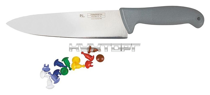 Шеф-нож P.L. Proff Cuisine Pro-Line 81004111 используется на предприятиях общественного питания и торговли, в частных домах и квартирах для нарезки овощей, зелени, курицы, больших кусков мяса и рыбы. Модель оснащена цветными кнопками. Лезвие выполнено из нержавеющей стали, ручка - из пластика.