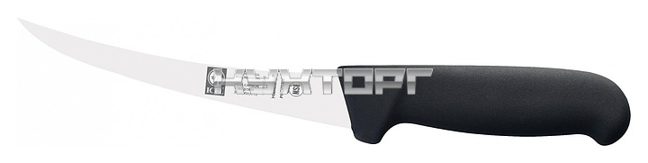 Обвалочный нож ICEL Safe Boning knife 28100.3856000.150 оснащен эргономичной ручкой черного цвета из приятного на ощупь пластика Proflex, устойчивого к высоким температурам и воздействию агрессивных элементов, и заточенным вручную изогнутым полугибким лезвием, выполненным из высококачественной нержавеющей стали X50CrMoV15 с добавлением хрома, молибдена и ванадия. Твердость стали, закаленной по специальной технологии, составляет более 56 HRC. Ручка, изготовленная по системе инжекции, имеет специальную антибактериальную защиту Microban.
