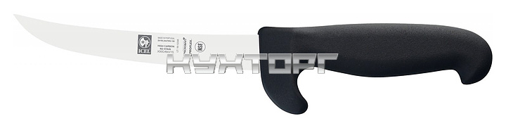 Обвалочный нож ICEL Protec Boning knife 28100.2447000.150 оснащен эргономичной ручкой черного цвета из приятного на ощупь пластика Proflex, устойчивого к высоким температурам и воздействию агрессивных элементов, и заточенным вручную широким изогнутым лезвием, выполненным из высококачественной нержавеющей стали X50CrMoV15 с добавлением хрома, молибдена и ванадия. Твердость стали, закаленной по специальной технологии, составляет более 56 HRC. Ручка оснащена специальным выступом, защищающим руку от соскальзывания и имеет специальную антибактериальную защиту Microban.