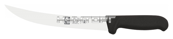 Обвалочный нож ICEL Poly Breaking knife 24100.3512000.250 оснащен эргономичной ручкой черного цвета из полипропилена, устойчивого к высоким температурам и внешнему воздействию, и заточенным вручную изогнутым лезвием, выполненным из высококачественной нержавеющей стали X50CrMoV15 с добавлением хрома, молибдена и ванадия. Твердость стали, закаленной по специальной технологии, составляет более 56 HRC.