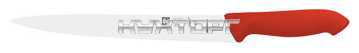 Нож для мяса ICEL Horeca Prime Horeca Prime Carving knife 28400.HR14000.250 оснащен эргономичной ручкой красного цвета из приятного на ощупь пластика Proflex, устойчивого к высоким температурам и воздействию агрессивных элементов, и заточенным вручную лезвием, выполненным из высококачественной нержавеющей стали X50CrMoV15 с добавлением хрома, молибдена и ванадия. Твердость стали, закаленной по специальной технологии, составляет более 56 HRC. Ручка, изготовленная по системе инжекции, имеет специальную антибактериальную защиту Microban.