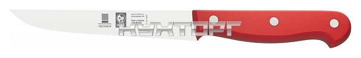 Обвалочный нож ICEL Technik Boning knife 27400.8606000.150 оснащен эргономичной ручкой красного цвета из полиоксиметилена, устойчивого к высоким температурам, и заточенным вручную лезвием, выполненным из высококачественной нержавеющей стали X50CrMoV15 с добавлением хрома, молибдена и ванадия. Твердость стали, закаленной по специальной технологии, составляет более 56 HRC. Ручка соединена с лезвием посредством заклепок из нержавеющей стали.