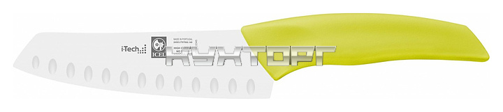 Японский нож для шефа ICEL I-Tech Santoku knife 24503.IT87000.140 оснащен эргономичной ручкой салатового цвета из полипропилена, устойчивого к высоким температурам и внешнему воздействию, и заточенным вручную лезвием, выполненным из высококачественной нержавеющей стали X50CrMoV15 с добавлением хрома, молибдена и ванадия. Твердость стали, закаленной по специальной технологии, составляет более 56 HRC.