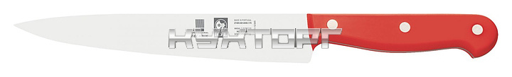Нож для мяса ICEL Technik Carving knife 27400.8614000.170 оснащен эргономичной ручкой красного цвета из полиоксиметилена, устойчивого к высоким температурам, и заточенным вручную лезвием, выполненным из высококачественной нержавеющей стали X50CrMoV15 с добавлением хрома, молибдена и ванадия. Твердость стали, закаленной по специальной технологии, составляет более 56 HRC. Ручка соединена с лезвием посредством заклепок из нержавеющей стали.