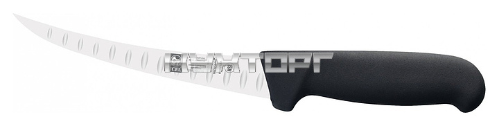 Обвалочный нож ICEL Safe Boning knife 28100.3851000.150 оснащен эргономичной ручкой черного цвета из приятного на ощупь пластика Proflex, устойчивого к высоким температурам и воздействию агрессивных элементов, и заточенным вручную изогнутым лезвием с бороздками, выполненным из высококачественной нержавеющей стали X50CrMoV15 с добавлением хрома, молибдена и ванадия. Твердость стали, закаленной по специальной технологии, составляет более 56 HRC. Ручка, изготовленная по системе инжекции, имеет специальную антибактериальную защиту Microban.
