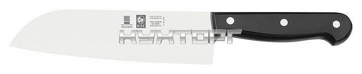 Японский нож для шефа ICEL Technik Santoku knife 27100.8625000.180 оснащен эргономичной ручкой черного цвета из полиоксиметилена, устойчивого к высоким температурам, и заточенным вручную лезвием с бороздками, выполненным из высококачественной нержавеющей стали X50CrMoV15 с добавлением хрома, молибдена и ванадия. Твердость стали, закаленной по специальной технологии, составляет более 56 HRC. Ручка соединена с лезвием посредством заклепок из нержавеющей стали.
