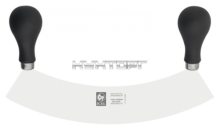 Нож для нарезки ICEL Practica Vegetable mincer 24100.9850000.220 оснащен двумя эргономичными ручками черного цвета из полипропилена, устойчивого к высоким температурам и внешнему воздействию, и заточенным вручную лезвием, выполненным из высококачественной нержавеющей стали X50CrMoV15 с добавлением хрома, молибдена и ванадия. Твердость стали, закаленной по специальной технологии, составляет более 56 HRC.
