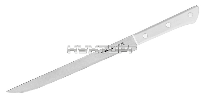 Японский кухонный нож Samura Harakiri SHR-0048W предназначен для тонкой нарезки и филирования рыбы или мяса на предприятиях общественного питания и торговли, в частных домах и квартирах. Особая форма и гибкость лезвия позволяют с легкостью "обходить" даже очень крупные суставы. Лезвие выполнено из коррозионно-стойкой однослойной стали AUS-8, ручка - из ABS-пластика.