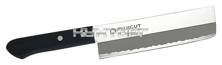 Нож накири Fuji Cutlery FC-1622 используется на предприятиях общественного питания и в домашних условиях для быстрого шинкования различных корнеплодов, овощей и фруктов. Изделие оснащено прямым массивным клинком с острой заточкой режущей кромки и сбалансированной рукояткой. Клинок выполнен из короззионостойкой молибден-ванадиевой стали (Mo-V) высокой твердости, рукоятка – из полипропилена черного цвета.