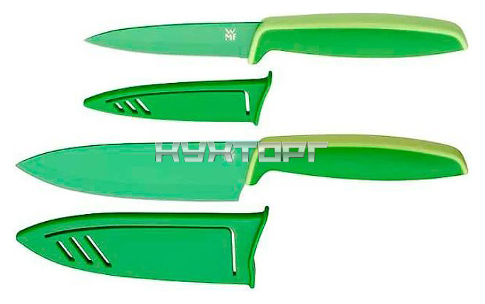 В комплект поставки входят универсальный нож длиной 9 см, поварской нож длиной 13 см и 2 чехла для ножей.