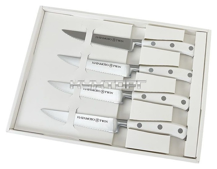 Набор ножей Hatamoto H1401 серии Twin используется на предприятиях общественного питания и в домашних условиях для нарезки готовых стейков, шашлыка, антрекотов, сала и других мясных продуктов в процессе сервировки. Изделия оснащены прямыми заостренными кверху лезвиями и удобными рукоятками. Лезвия выполнены из высококачественной нержавеющей стали AUS-8, рукоятки – из прочного термопластика GRN светло-серого цвета.