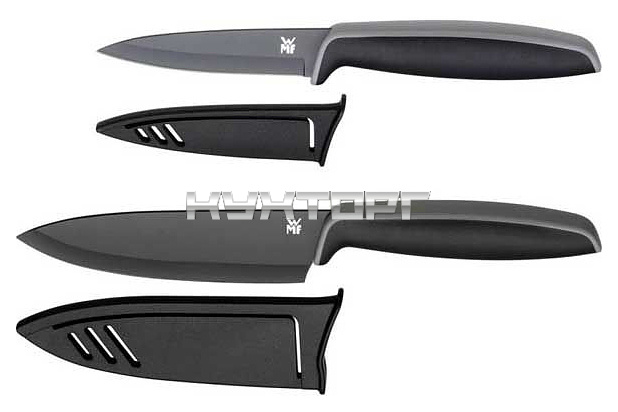 В комплект поставки входят универсальный нож длиной 9 см, поварской нож длиной 13 см и 2 чехла для ножей.