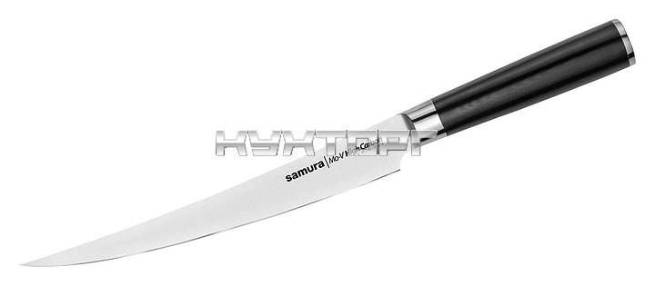 Японский кухонный нож Samura Mo-V SM-0047 предназначен для нарезки филе, рыбных и мясных деликатесов, фруктов, овощей и других продуктов на предприятиях общественного питания и торговли, в частных домах и квартирах. Прочный клинок не только успешно противостоит ржавлению, но и способен длительное время сохранять безупречность режущей кромки. Лезвие выполнено из коррозионно-стойкой однослойной стали AUS-8, ручка - из стеклоткани G-10.