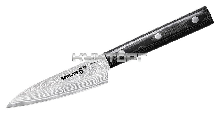 Японский кухонный нож Samura Damascus 67 SD67-0010M предназначен для чистки и нарезки овощей и фруктов на предприятиях общественного питания и торговли, в частных домах и квартирах. Режущая часть совершенно не подвержена коррозии, не боится ударных и поперечных нагрузок, химически нейтральна. Лезвие выполнено из дамасской стали, ручка - из микарты.