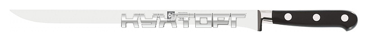 Нож для нарезки ветчины ICEL Universal Ham slicing knife 27100.UN17000.300 оснащен эргономичной ручкой черного цвета из полиоксиметилена, устойчивого к высоким температурам, и заточенным вручную лезвием, выполненным из высококачественной нержавеющей стали X50CrMoV15 с добавлением хрома, молибдена и ванадия. Изделие выполнено методом ковки. Твердость стали, закаленной по специальной технологии, составляет более 56 HRC. Лезвие соединено с ручкой посредством заклепок из нержавеющей стали.