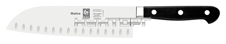 Японский нож для шефа ICEL Maitre Santoku knife 27100.7485000.180 оснащен эргономичной ручкой черного цвета из полиоксиметилена, устойчивого к высоким температурам, и заточенным вручную лезвием с бороздками, выполненным из высококачественной нержавеющей стали X50CrMoV15 с добавлением хрома, молибдена и ванадия. Твердость стали, закаленной по специальной технологии, составляет более 56 HRC. Изделие выполнено методом ковки. Ручка соединена с лезвием посредством заклепок из нержавеющей стали.