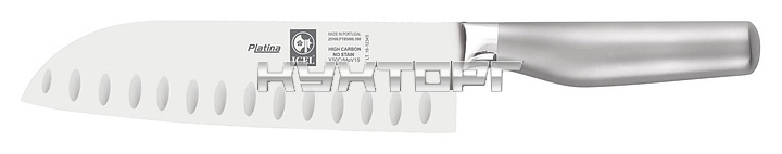 Японский нож ICEL Platina Santoku knife 25100.PT85000.180 оснащен эргономичной нескользящей ручкой из нержавеющей стали AISI 304 и заточенным вручную лезвием, выполненным из высококачественной нержавеющей стали X50CrMoV15 с добавлением хрома, молибдена и ванадия. Твердость стали, закаленной по специальной технологии, составляет более 56 HRC.