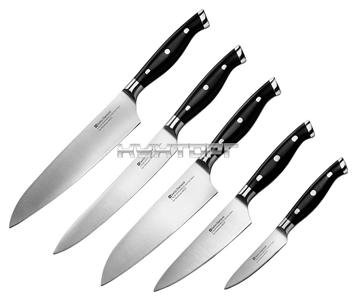 Набор кухонных ножей Swiss Diamond SDPKSET02 предназначен для нарезки различных продуктов на предприятиях общественного питания и торговли, а также в домашних условиях. Ножи оснащены острыми лезвиями и рукоятками с удобным захватом. Лезвия выполнены из молибден-ванадиевой стали 1.4116 (X50 Cr Mo V 15) с технологией низкотемпературной закалки, рукоятки – из ацетальной смолы (полиоксиметилен), больстеры – из нержавеющей стали.