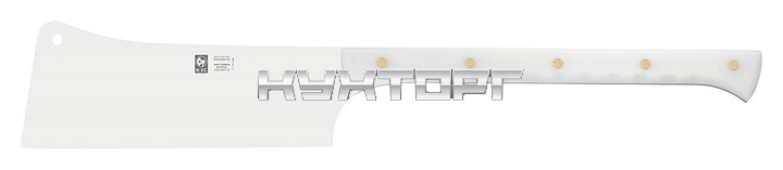 Топор для рубки говядины ICEL Talho Beef splitter 39200.4050000.350 оснащен эргономичной ручкой белого цвета из пластика, устойчивого к высоким температурам и внешнему воздействию, заклепками из нержавеющей стали и заточенным вручную лезвием, выполненным из высококачественной нержавеющей стали с добавлением хрома, молибдена и ванадия. Твердость стали, закаленной по специальной технологии, составляет более 56 HRC.