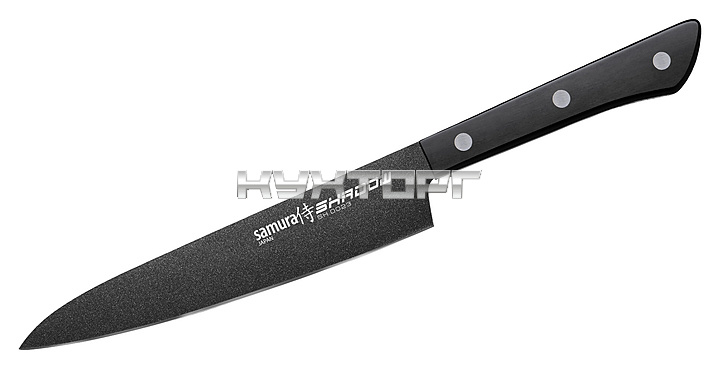 Японский кухонный нож Samura Shadow SH-0023 предназначен для нарезки различных продуктов на предприятиях общественного питания и торговли, в частных домах и квартирах. Нож хвостовика проходит через всю длину пластиковой рукояти. Лезвие выполнено из коррозионно-стойкой однослойной стали AUS-8, ручка - из ABS-пластика.