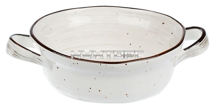 Бульонница_ P.L. Proff Cuisine White Fusion P5225920/0525-2 предназначена для подачи бульона и других первых блюд на предприятиях общественного питания и в домашних условиях. Модель круглого сечения оснащена 2 рукоятками. Изделие выполнено из фарфора с поверхностью белого цвета с декоративным крапом и кантами на кромке и рукоятках в коричневых тонах.