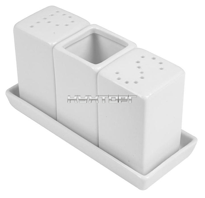 Набор для специй Lambert 3 предмета предназначен для использования на предприятиях общественного питания и торговли, а также в частных домах, квартирах, отелях и офисах. Комплект состоит из трех емкостей прямоугольной формы: для соли, перца и зубочисток и подставки. Изделия выполнены из фарфора.